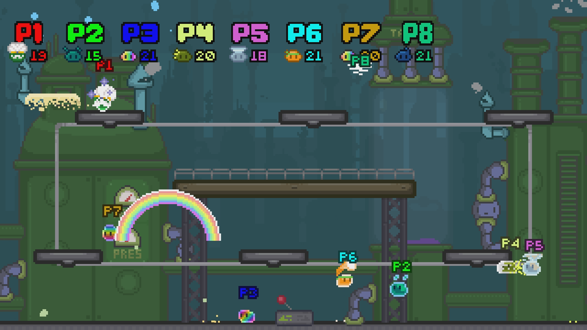 Super Slime Arena is a party/fighting game where every attack is a one-hit K.O., developed by JellyTeam.